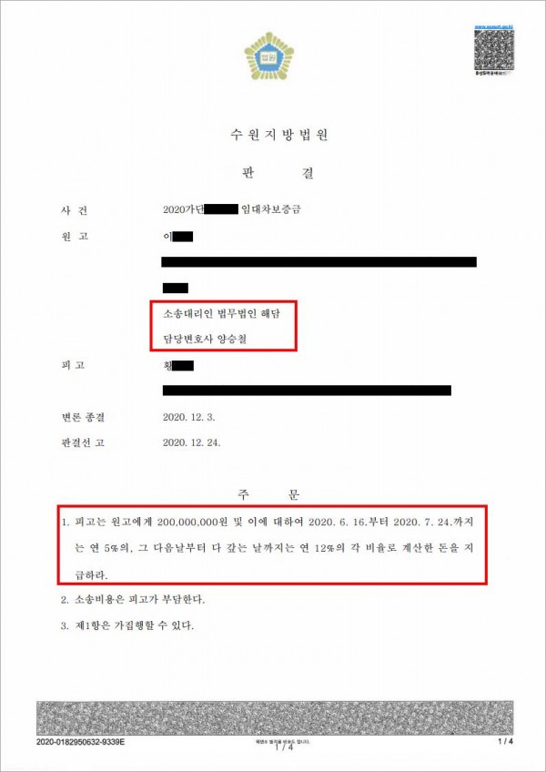 [민사] [임대차보증금반환] 임대차보증금 2억원 반환소송 전부 승소